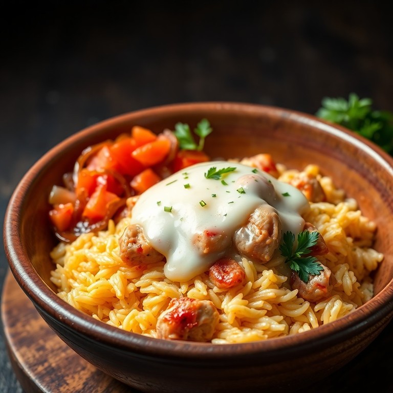 Un plato abundante que combina arroz cremoso con pollo y salchicha, enriquecido con queso derretido y la frescura del tomate y la cebolla caramelizada.