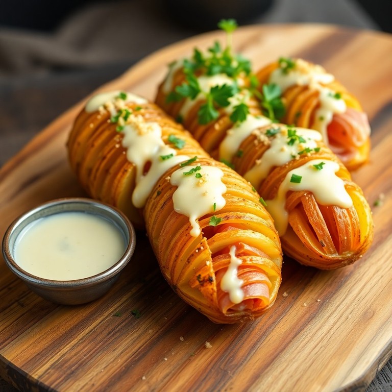 Papas Hasselback con Jamón Serrano, Queso Manchego y Salsa de Ajo al Horno