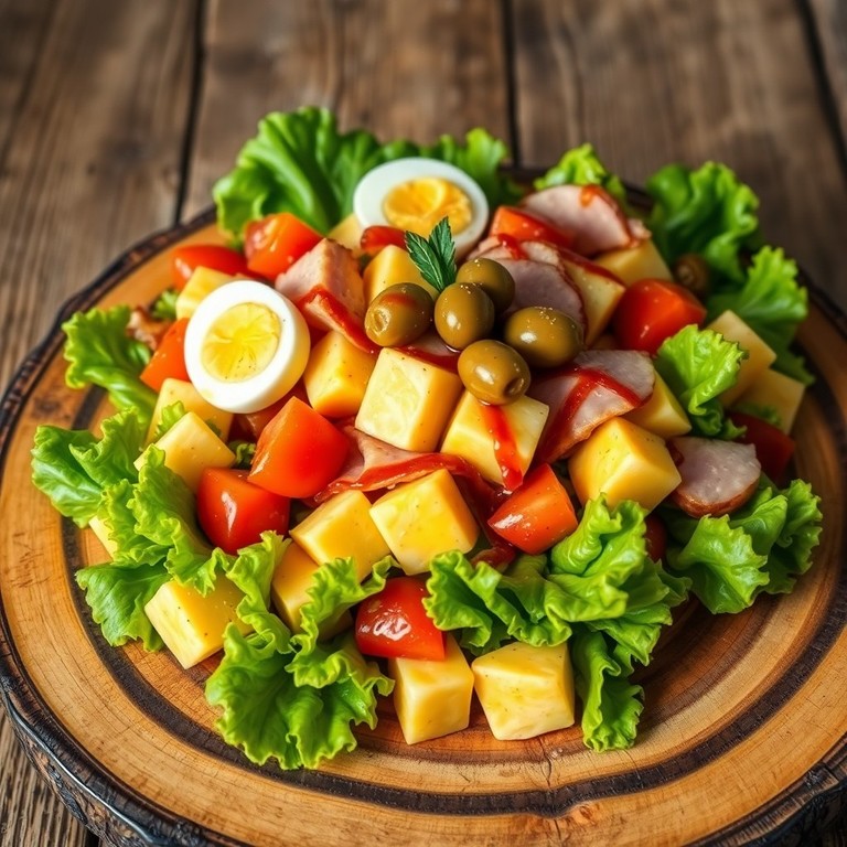 Un plato fresco y colorido que combina huevos cocidos, queso gouda en cubos, jamón, tomate y lechuga, todo mezclado con aceitunas y un aderezo ligero para una cena nutritiva y fácil de preparar.