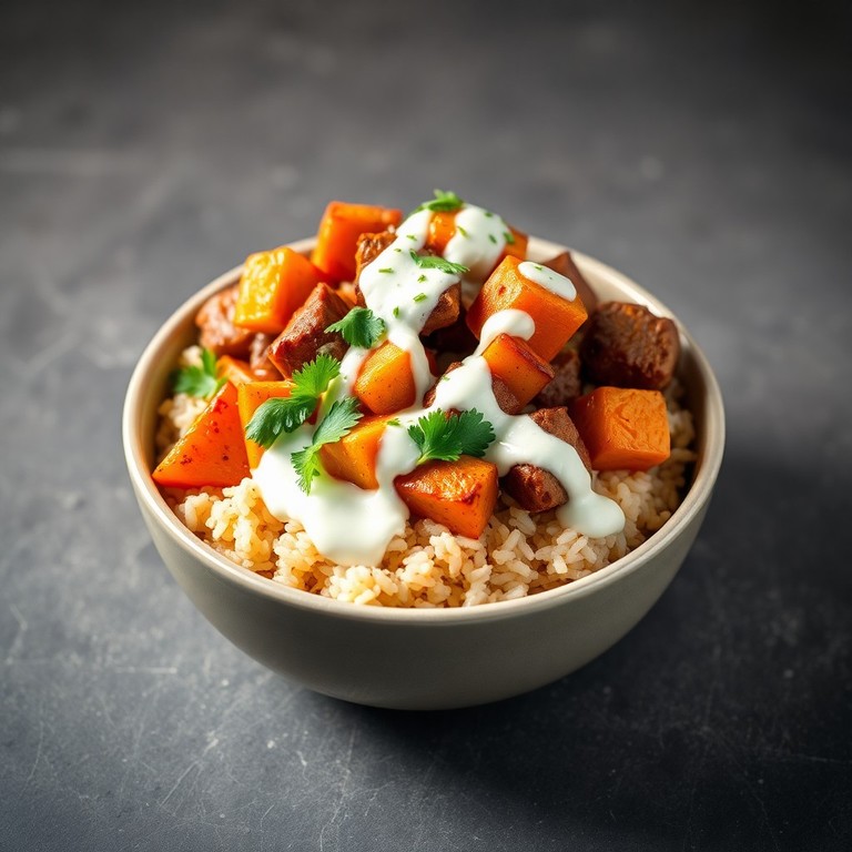 Uma tigela nutritiva e saborosa com arroz integral, cubos de bife salteados com especiarias, batata doce assada e um molho de iogurte de ervas refrescante. Ideal para um almoço rápido e saudável.