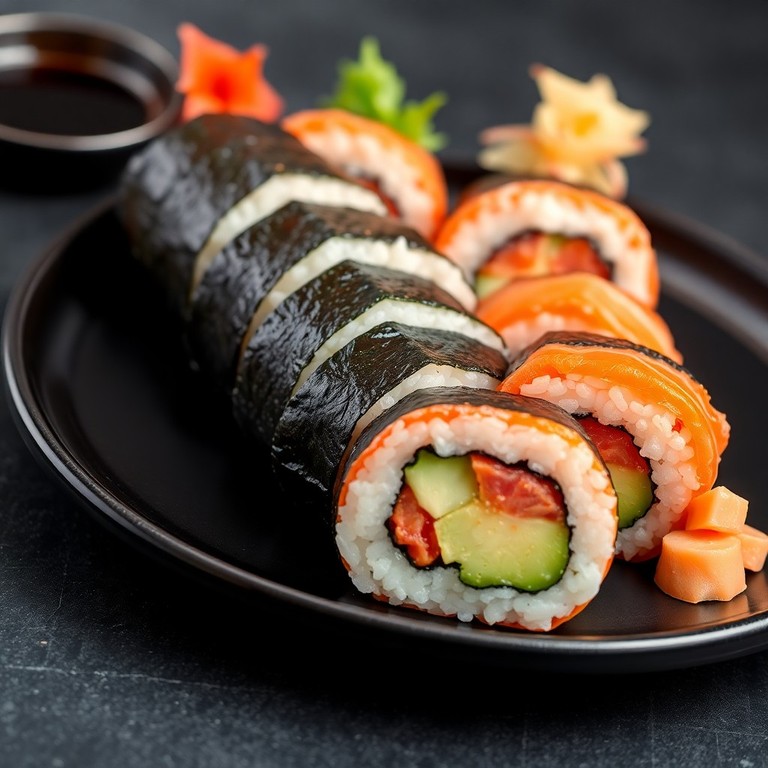 Sushi tradicional de salmón y aguacate: Una opción clásica y deliciosa, perfecta para principiantes. Relleno cremoso y pescado fresco, fácil de enrollar y disfrutar en casa.