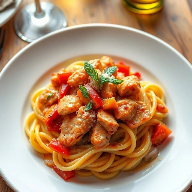 Salteado de Pollo y Pimiento Rojo con Fideos Cremosos al Orégano
