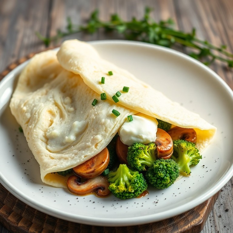 Uma omelete nutritiva com claras, brócolis picado, cogumelos salteados e queijo cottage. Uma opção proteica e de baixa caloria para o café da manhã ou jantar.