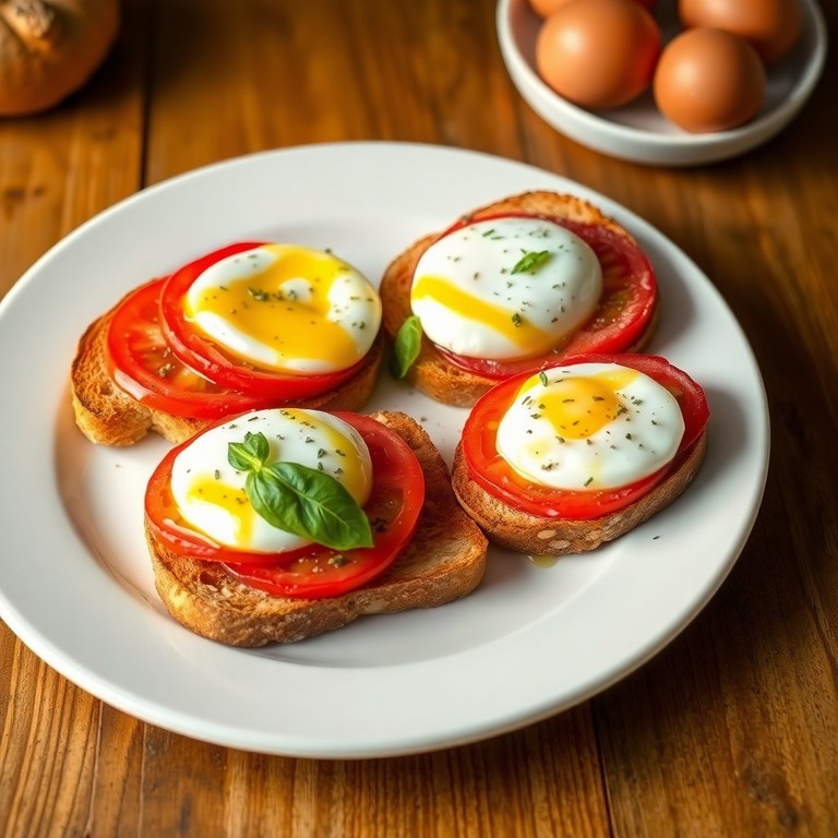 Deliciosas tostadas integrales con tomate fresco y un huevo pochado, perfectas para un desayuno ligero y lleno de sabor.