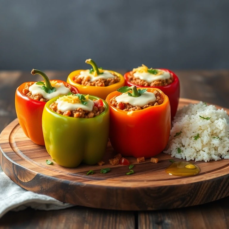 Pimientos rellenos horneados con una mezcla sabrosa de carne molida, arroz y tomate, cubiertos con una capa de natilla derretida para una comida abundante y satisfactoria.