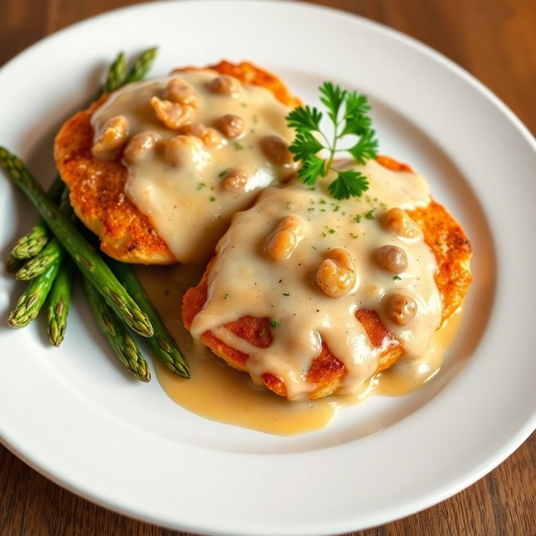 Pechugas de Pollo a la Francesa con Salsa Gruyère y Espárragos