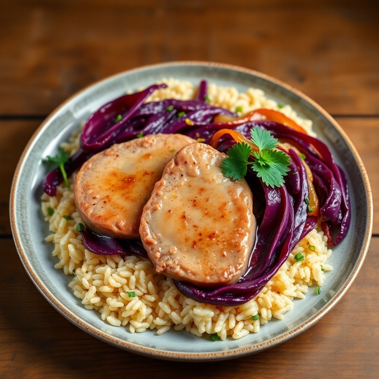 Une version exotique de l'escalope de veau, mijotée lentement avec du chou rouge, de l'oignon et des épices douces, accompagnée d'un riz parfumé à l'ail et au persil.