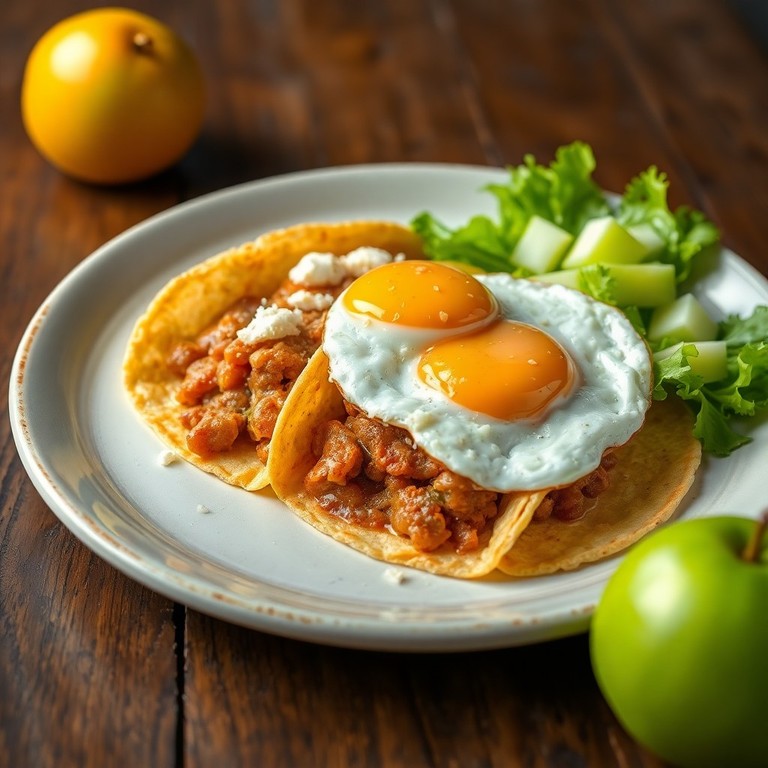 Tortillas de maíz rellenas de un guiso cremoso de frijoles refritos con jitomate y especias, cubiertas con huevo estrellado y una refrescante ensalada de lechuga y manzana. Un plato reconfortante y lleno de sabor, perfecto para el desayuno o la cena.