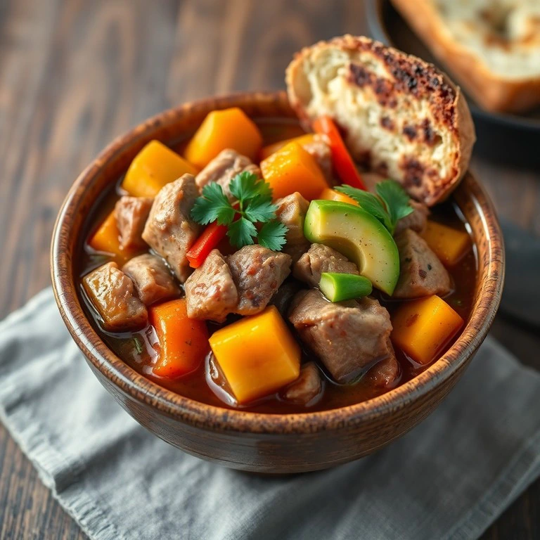 Un guiso reconfortante y sustancioso donde la carne de cerdo se cocina a fuego lento con papas, zanahorias y aguacate cremoso, sazonado con chile dulce para un toque de calor. Ideal para los días fríos.