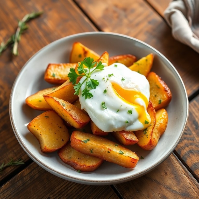 Papas al Horno con Huevo Poché y Hierbas Frescas: Una opción ligera donde las papas se hornean en lugar de freírse, coronadas con un huevo poché para añadir cremosidad sin grasas añadidas. Aderezado con hierbas frescas para un sabor vibrante y natural.