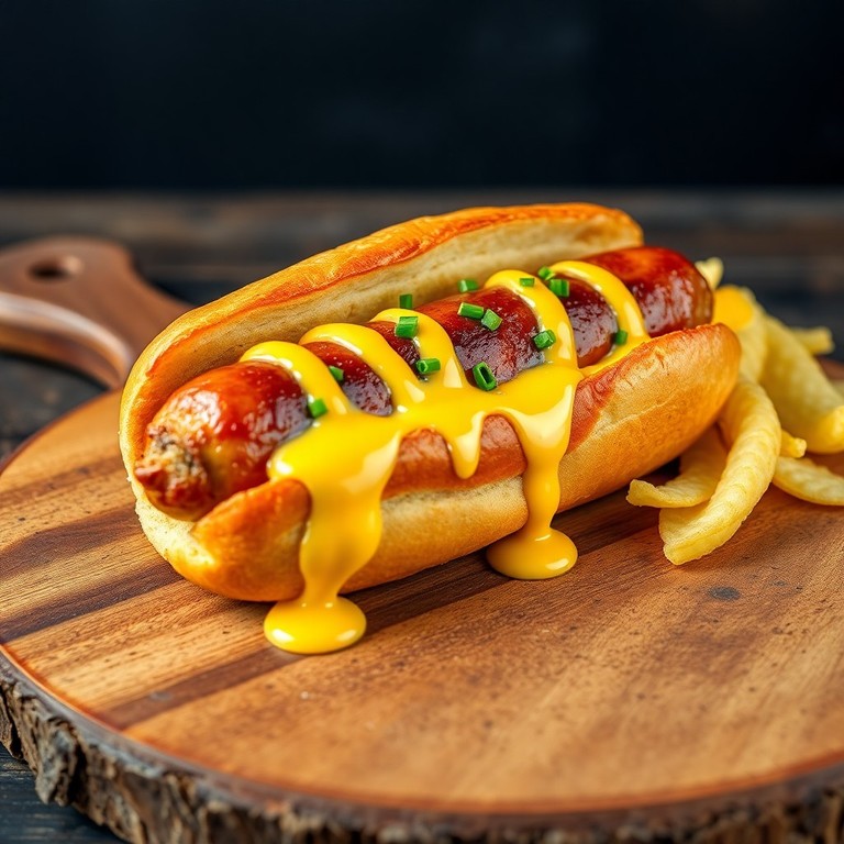 Una versión sofisticada del clásico hot dog callejero. Salchichas premium a la parrilla, bañadas en una salsa de queso cheddar añejo con un toque de mostaza Dijon, servidas en pan brioche tostado.