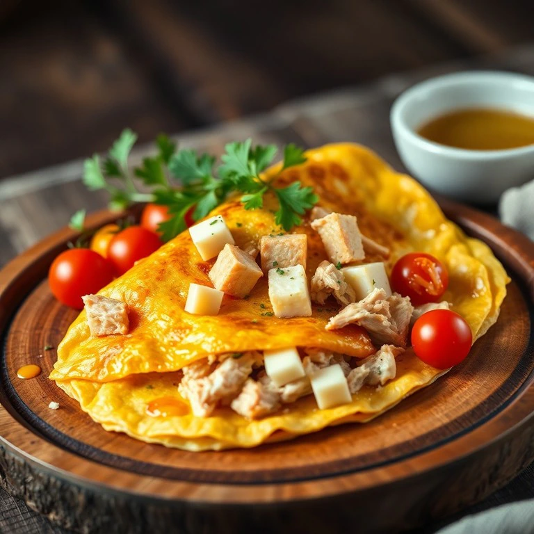 Omelete cremoso recheado com frango desfiado e queijo coalho, temperado com um toque de sal. Uma refeição rápida e nutritiva, perfeita para qualquer hora do dia.