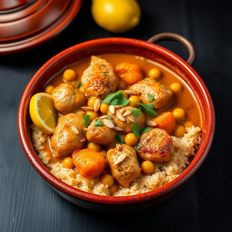 A flavorful Moroccan tagine featuring tender chicken and chickpeas simmered in a rich, aromatic sauce with dried apricots and almonds. Perfect for a cozy night in.