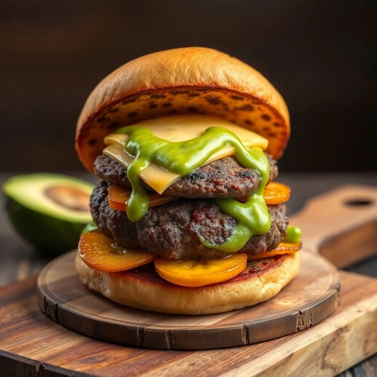 Receta de una hamburguesa que representa a Colombia Medellín, con carne de res sazonada con hogao, queso Antioqueño, plátano maduro caramelizado y salsa de aguacate.