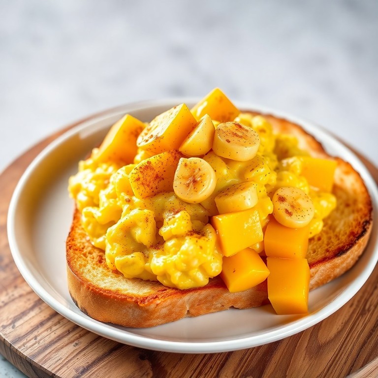 Un revuelto dulce y nutritivo que combina la suavidad de los huevos con el sabor tropical del plátano y el mango, servido sobre pan tostado con mantequilla. Ideal para un desayuno rápido y delicioso, listo en menos de 15 minutos.
