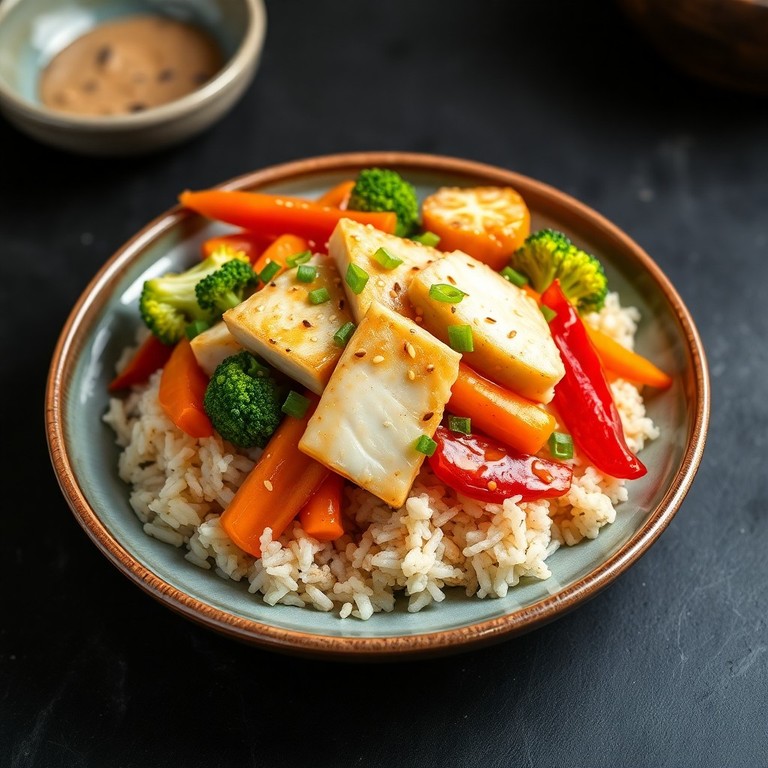 Un plato reconfortante de arroz integral salteado con pescado blanco, vegetales frescos y salsa de soja fermentada para un sabor umami profundo.