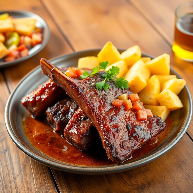 Costillas de res al barril adobadas con especias ahumadas, servidas con salsa criolla y papas rústicas asadas al limón.