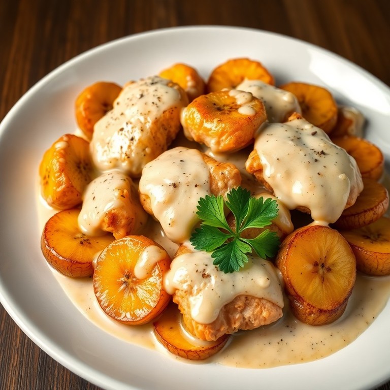 Un plato delicioso que combina pollo tierno con plátanos maduros en una salsa suave y cremosa, ideal para una comida reconfortante y rápida en solo 30 minutos.