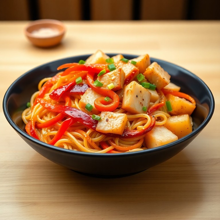 Fideos salteados con pimiento, zanahoria, papas y pollo en una deliciosa salsa de soja y jengibre. Esta receta rápida y llena de sabor es perfecta para una cena nutritiva y reconfortante con un toque asiático.