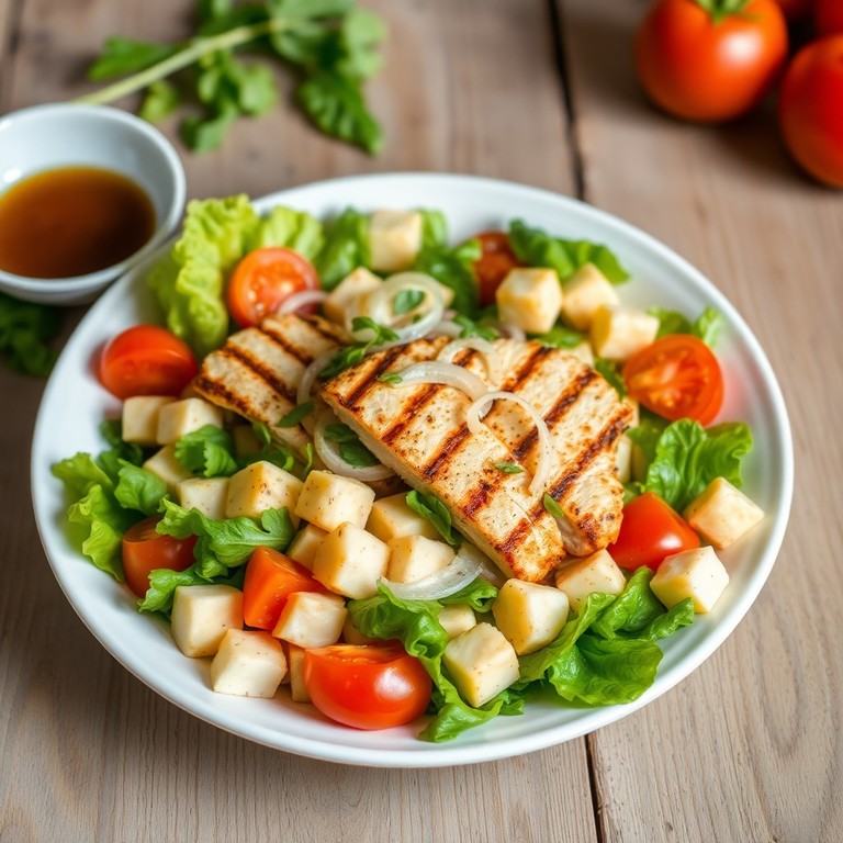Una ensalada fresca y sustanciosa que combina pollo a la plancha jugoso, yuca cocida suave, jitomate verde, lechuga italiana crujiente y un toque de vinagre balsámico para un sabor mediterráneo equilibrado y delicioso.