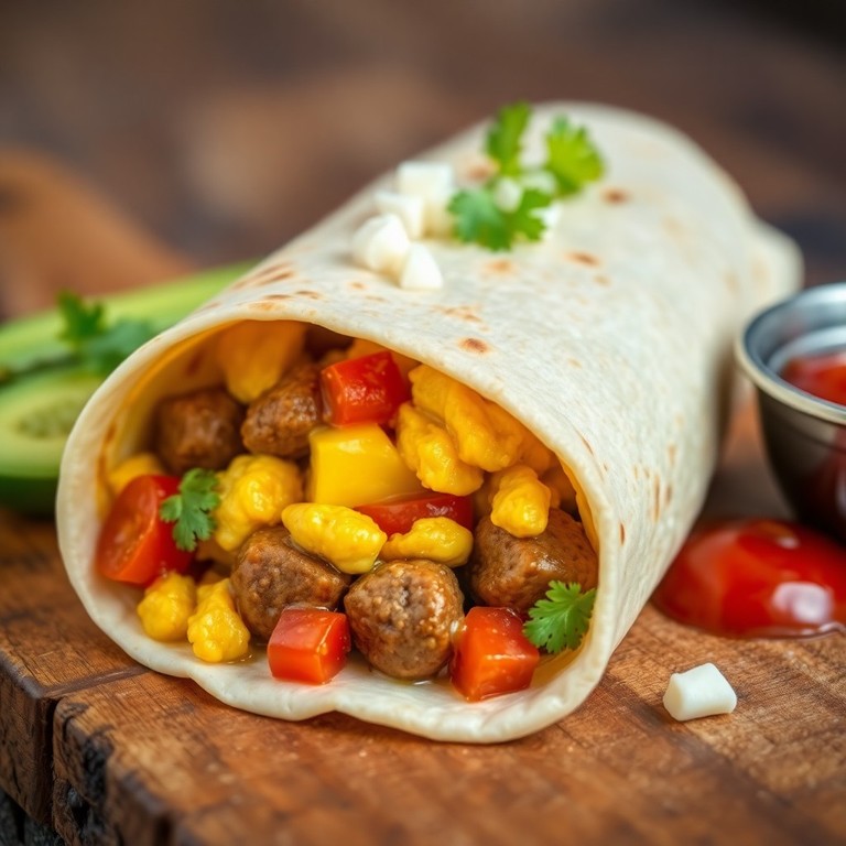 Burrito de desayuno con salchicha y huevo en salsa de tomate