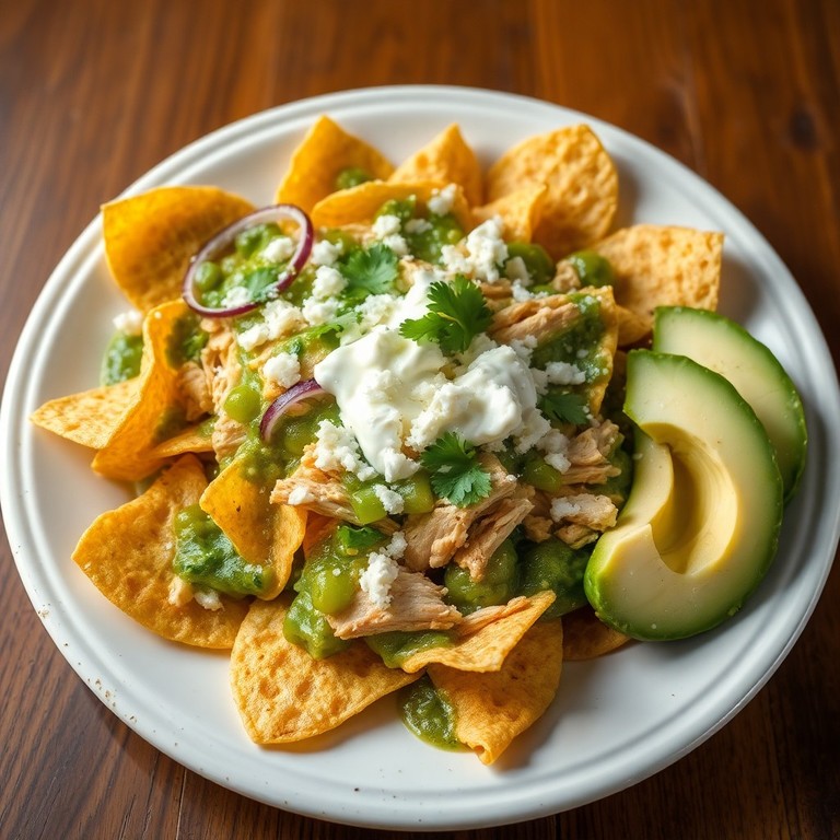 Tiras de totopos crujientes bañadas en salsa verde casera, acompañadas de pollo desmenuzado y queso fresco, ideales para un desayuno energético y lleno de sabor tradicional mexicano.