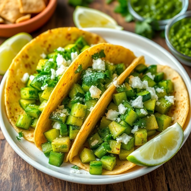Tacos sencillos y rápidos con calabacín fresco salteado y una salsa verde vibrante, ideales para una comida ligera y económica en solo 15 minutos.