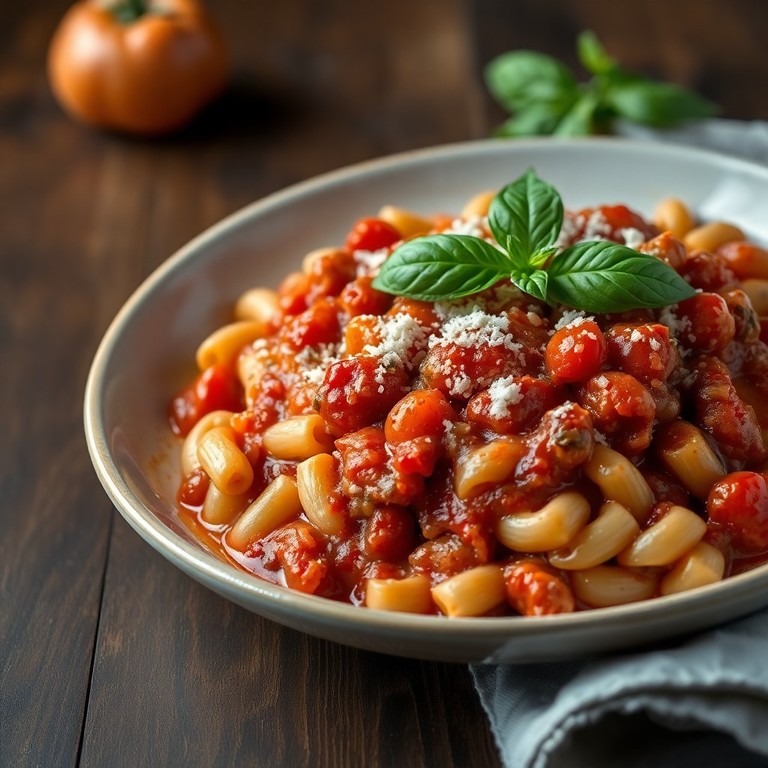 Una receta tradicional que combina fideos cortos con un tuco robusto hecho a base de tomates, cebolla y ajo, ideal para una comida reconfortante y sencilla.