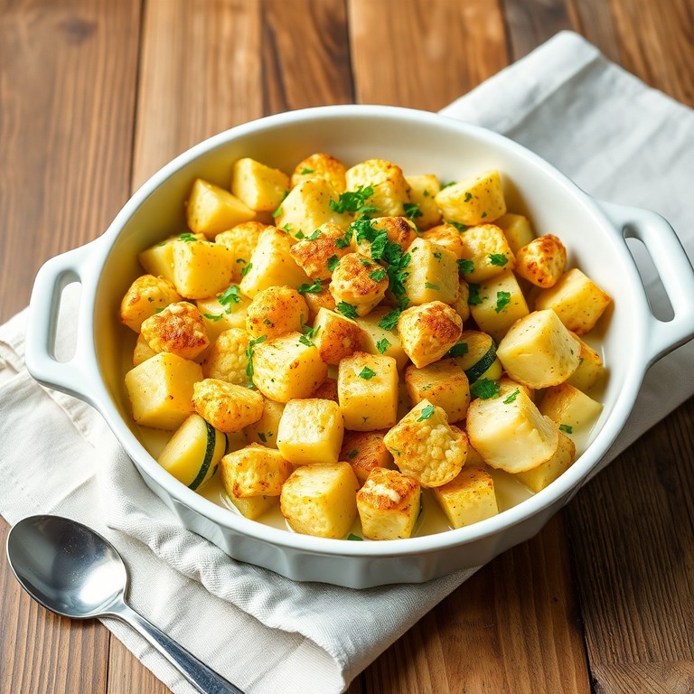 Een eenvoudige en gezonde ovenschotel met geroosterde bloemkool, courgette en aardappelen, afgewerkt met een romige crème fraîche saus. Perfect als voedzame maaltijd voor het hele gezin.