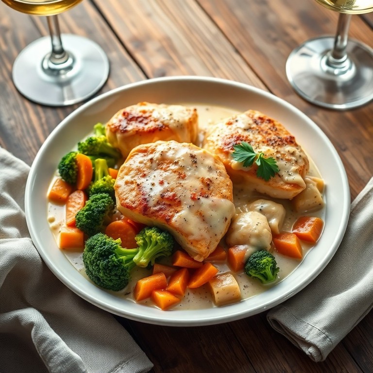 Un plato cremoso y reconfortante que combina pechuga de pollo dorada, una salsa rica de crema y queso parmesano, junto con brócoli y vegetales salteados, ideal para una cena elegante y fácil de preparar.