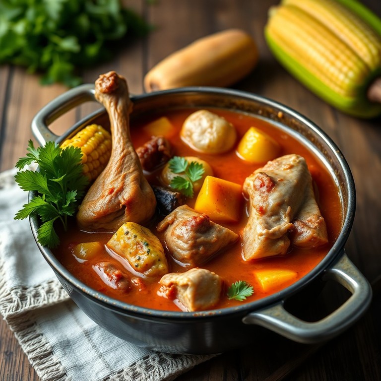 Este Sancocho Trifásico Tradicional ha sido adaptado para incluir arracacha y choclos, utilizando solo muslos y perniles de pollo junto con espinazo de cerdo, manteniendo todos los demás ingredientes originales para conservar su sabor auténtico y profundo. Perfecto para grandes reuniones, este caldo reconfortante combina tubérculos y verduras típicas colombianas para una experiencia culinaria completa.