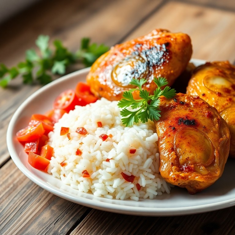 Pollo al ajillo con arroz aromático es un plato tradicional que combina muslos de pollo crujientes y sazonados con ajo, cocinados en freidora para una textura perfecta y rápida. Se acompaña con un arroz suave y fragante, cocinado con tomate y especias que realzan su sabor, creando un equilibrio delicioso y reconfortante.