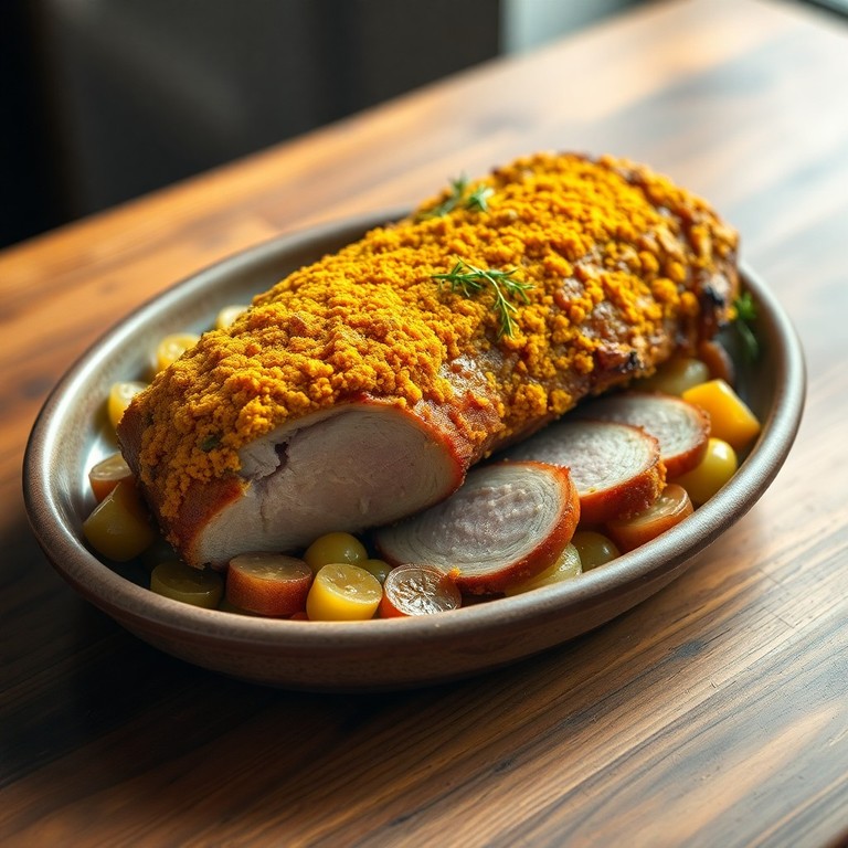 Un plato tradicional de cerdo asado en horno con una mezcla aromática de cúrcuma, ajo, cebolla y tomate verde que crea una corteza dorada y sabores intensos. Ideal para cenas especiales o celebraciones, este cerdo queda jugoso y lleno de matices gracias al comino y la técnica de horneado.