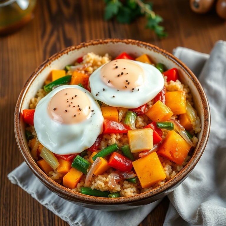 Un salteado colorido y nutritivo que combina puerros, cebolla, morrón y zapallo con arroz blanco, coronado con huevos pochados que aportan una textura cremosa y un sabor delicado. Ideal para una cena reconfortante y saludable.