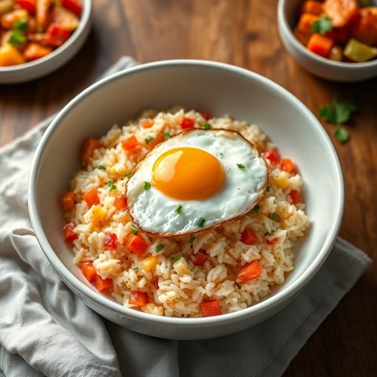 Un plato reconfortante y nutritivo que combina arroz cremoso cocido en leche con verduras salteadas y un huevo frito encima, ideal para una comida completa y fácil de preparar.