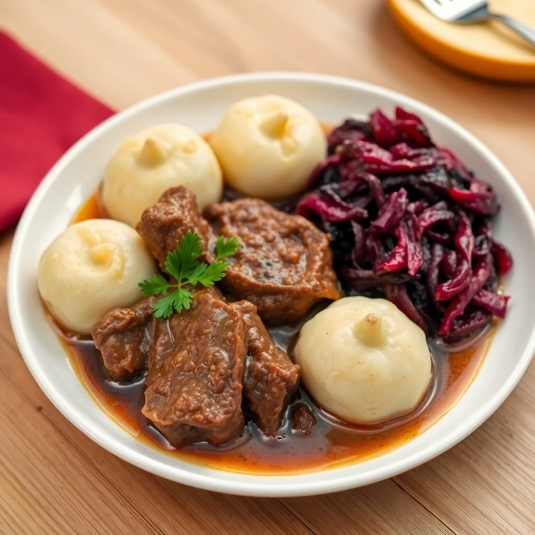 Ein traditionelles deutsches Gericht mit langsam mariniertem und geschmortem Rindfleisch, serviert mit hausgemachten Kartoffelknödeln und süß-säuerlichem Blaukraut. Perfekt für ein gemütliches Sonntagsessen und typisch für die deutsche Küche.