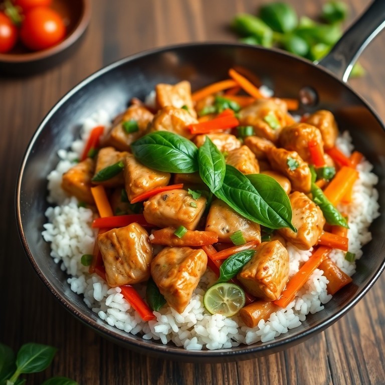 Ароматное и быстрое тайское блюдо с нежной свининой, обжаренной в соевом и рыбном соусах с добавлением свежего базилика и овощей, без использования помидоров. Идеально для тех, кто предпочитает блюда без томатов, сохраняя при этом яркий вкус и аромат.