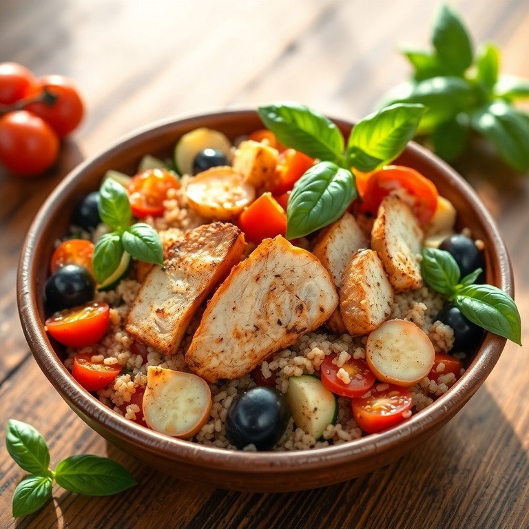Una ensalada templada saludable y vibrante que combina pollo asado, quinoa y verduras mediterráneas frescas y cocinadas ligeramente. Ideal para una comida ligera pero nutritiva, con un aliño cítrico que realza los sabores naturales.