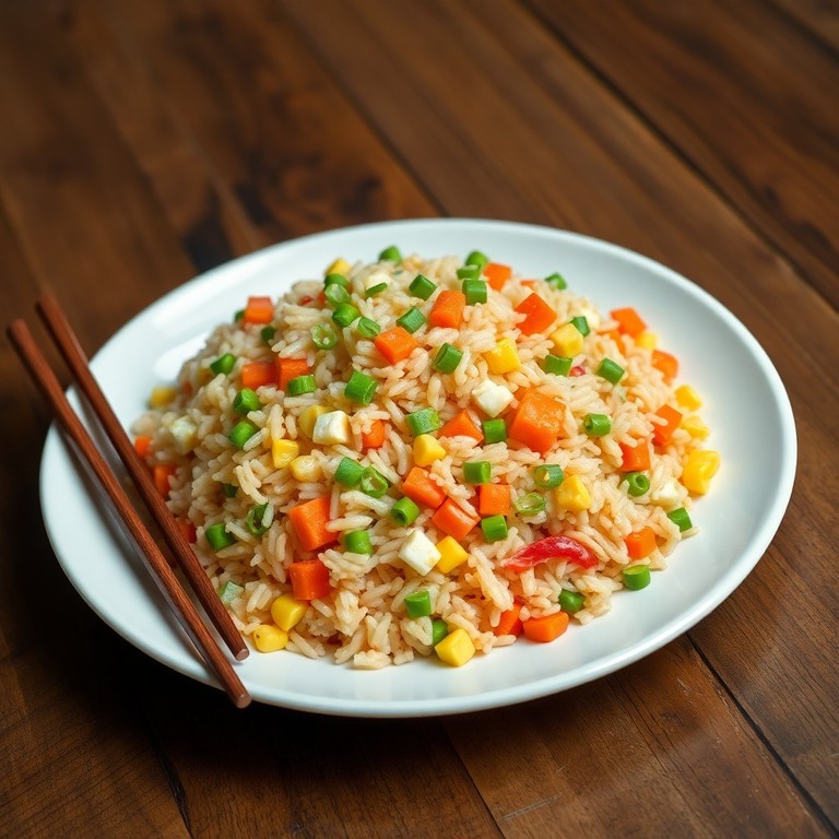 Um prato clássico asiático de arroz frito com arroz soltinho, legumes frescos e ovos mexidos, temperado com molho de soja e óleo de soja SOYA para um sabor autêntico e uma refeição rápida e saborosa.