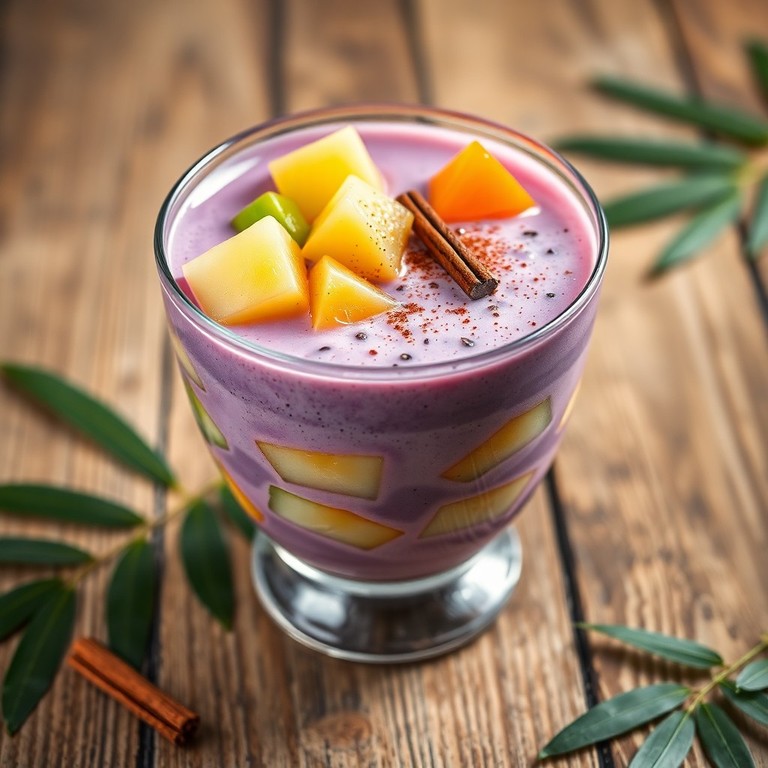 Un postre refrescante y aromático que combina la riqueza del maíz morado con la dulzura y textura de frutas tropicales y especias, ideal para disfrutar en días calurosos. La mazamorra se prepara infusionando frutas y especias, luego se espesa con chuño y se sirve fría, decorada con canela en polvo y cubitos de piña fresca para un toque extra de frescura.