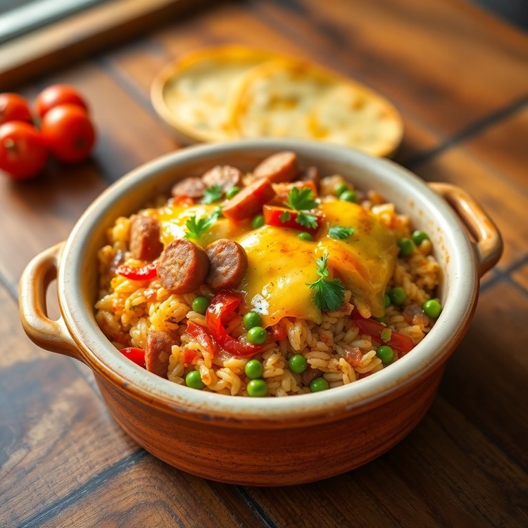 Uma receita reconfortante e prática de arroz de forno que combina linguiça calabresa defumada, legumes frescos e uma camada generosa de queijos gratinados. Ideal para um almoço fácil e saboroso, pronto em cerca de 40 minutos.