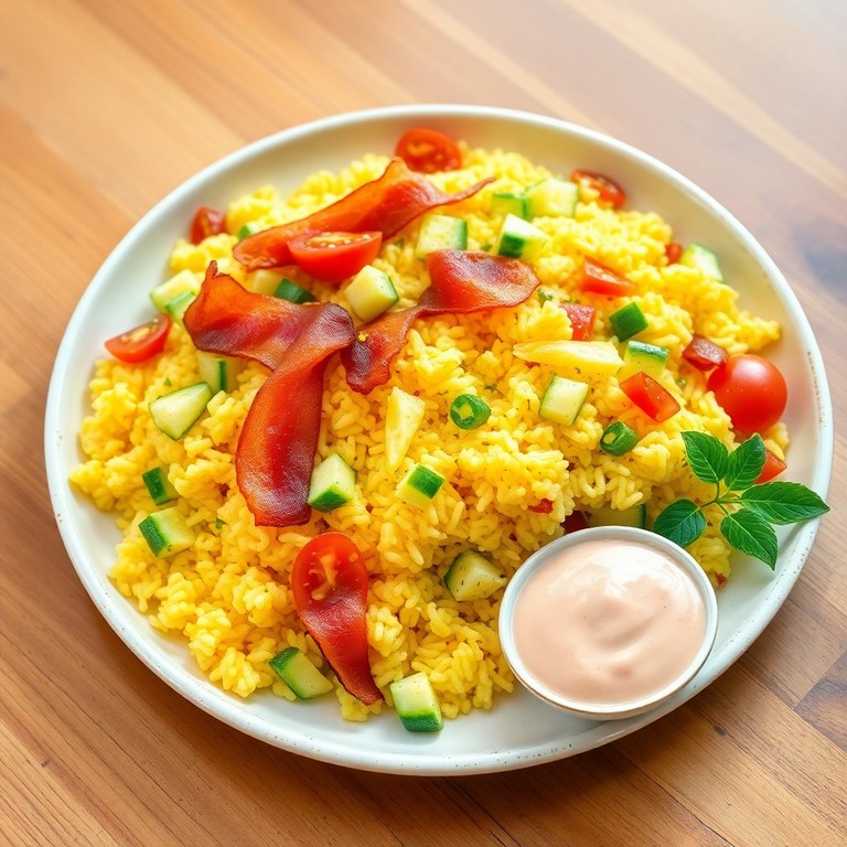 Revuelto de Arroz, Huevo y Tocino con Toques de Limón y Ajo