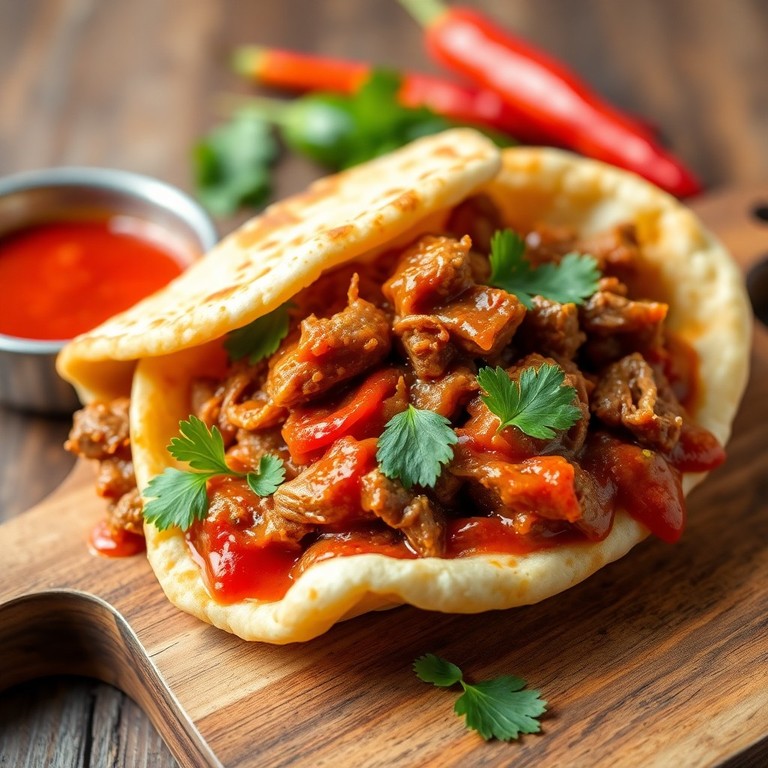 Arepa suave con carne desmechada jugosa y una salsa picante casera, ideal para una comida contundente y llena de sabor. Esta receta combina la textura tradicional de la arepa con un relleno intenso y aromático que hará las delicias de cualquier amante de la comida latinoamericana.