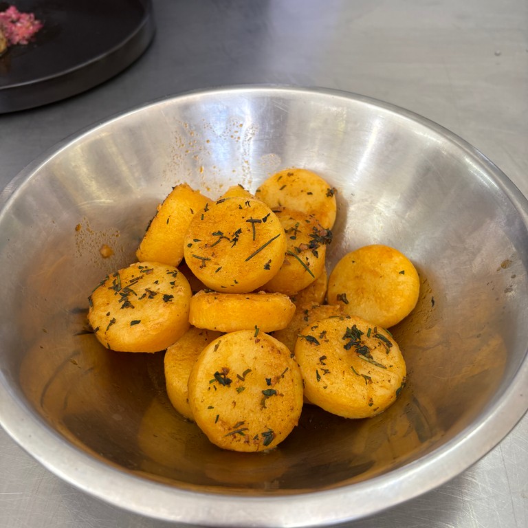 Deliciosas papas fondant cortadas en forma cilíndrica, cocinadas en mantequilla con un toque de caldo para lograr una textura suave y bañadas en salsa demi glace, sazonadas con sal, pimienta y perejil fresco.