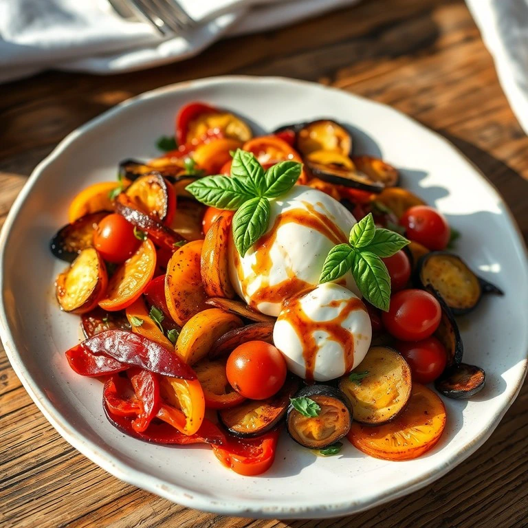 Una ensalada templada que combina verduras asadas aromáticas con la suavidad cremosa del queso burrata, ideal para una comida ligera y sofisticada en verano.