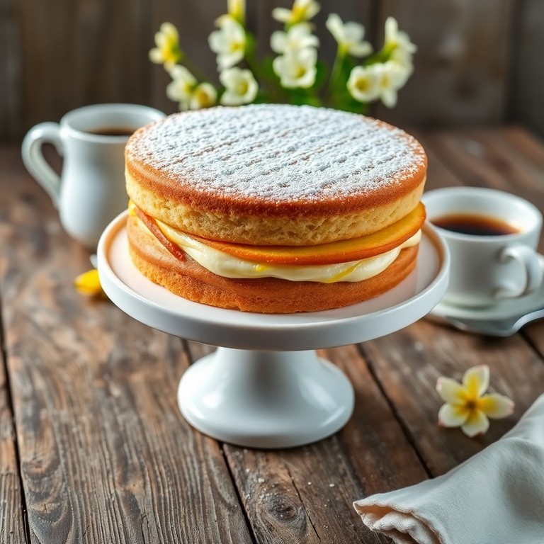 Um bolo leve e aromático de baunilha com raspas de limão siciliano, recheado com um creme de leite fresco adoçado com leite condensado, perfeito para acompanhar um café sofisticado.