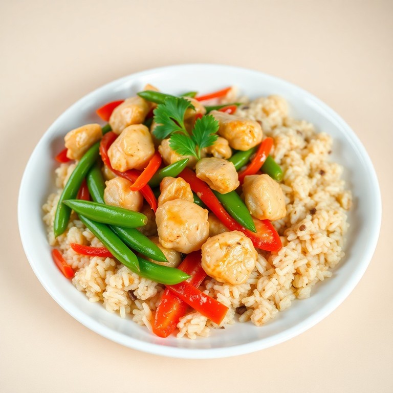 Un plato nutritivo y colorido que combina pollo tierno, verduras frescas y arroz integral en un salteado rápido y lleno de sabor. Ideal para una cena saludable y equilibrada, con ingredientes frescos y técnicas sencillas que preservan la textura y el sabor natural de cada componente.