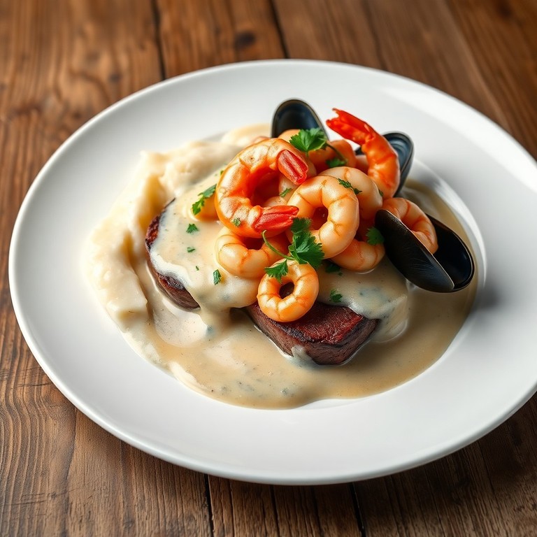 Un plato elegante que combina la jugosidad del lomo de res con una salsa suave y aromática de mariscos, ideal para ocasiones especiales. La salsa cremosa realza los sabores del marisco fresco, complementando perfectamente la textura tierna de la carne.