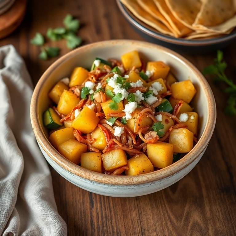 Un salteado rápido y sabroso que combina calabazas, papas, machaca y cebolla, perfecto para una cena sencilla y llena de sabor. Esta receta incluye queso fresco y tomate para aportar frescura y textura, ideal para disfrutar con tortillas calientes.