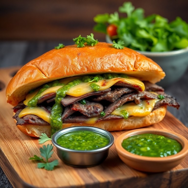 Un clásico argentino llevado al pan, este sándwich combina carne asada jugosa, queso fundido cremoso y una salsa chimichurri fresca y aromática para un bocado lleno de sabor y tradición.
